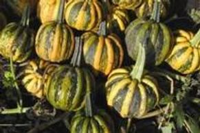 Eye-catching, medium-sized, black striped pumpkins. Usually 5 to 8 pounds, you can scoop out the large, dark green, completely hull-less seeds, which are delicious roasted.