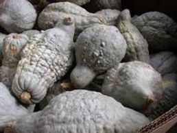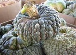 A decorative fruit, slate-gray color with heavy, rounded ribs and weighs 6 to 10 pounds. Thick, sweet, orange flesh of good quality and an excellent storage squash will add interest and color to fall displays.