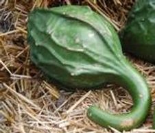 A bulb-shaped fruit with a curved neck. Large vines produce creamy-white fruit that are mottled with green stripes. The light yellow flesh is slightly sweet and fine for pies and baking.
