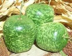 Apple shaped gourds have a mottled green color and measure 6 to 8 inches in diameter. A variety of sizes are produced and the shape can vary from round to an upright delicious apple shape. A very novel fall crafting item.